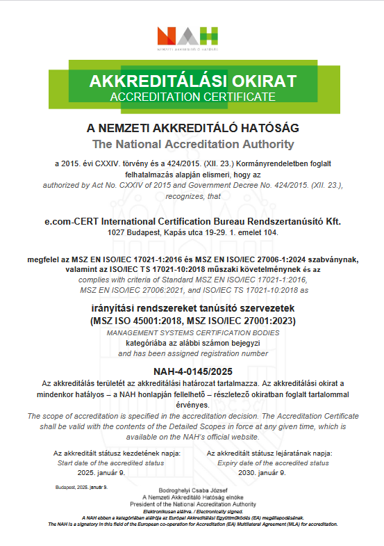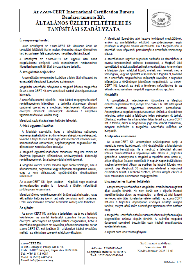 Az e.com-CERT International Certification Bureau Rendszertanúsító Kft. a gazdálkodó szervezetek működését segítő menedzsment rendszerek